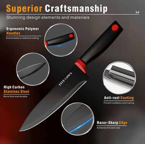 This set isn’t just about looks—it’s built to perform. Whether you’re slicing fresh vegetables, carving a holiday roast, or enjoying a perfectly cooked steak, these knives deliver precision and ease every time.