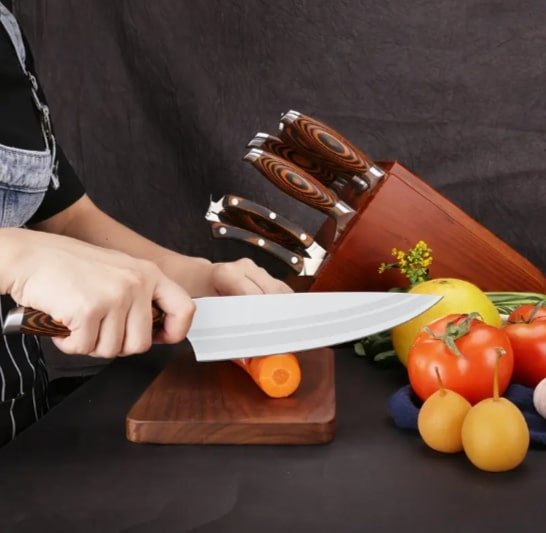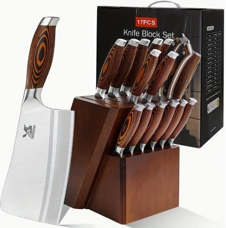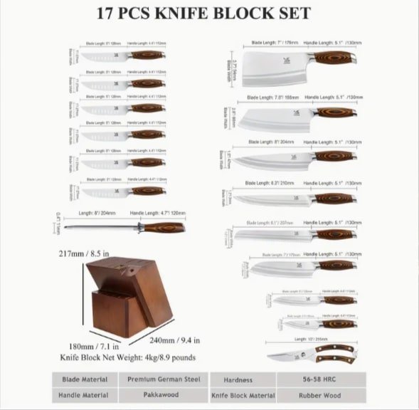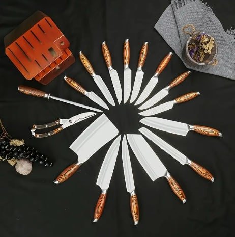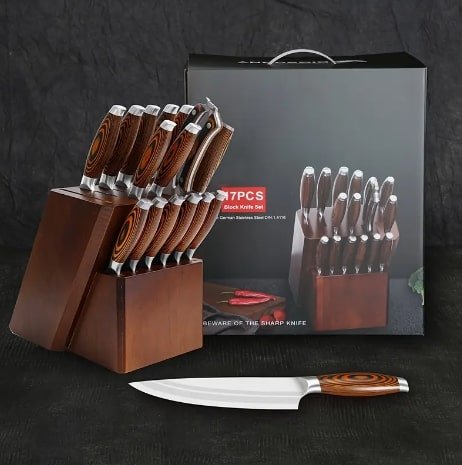 Master every culinary task with this premium 17-Piece German Stainless Steel Chef Knife Set. Each blade is precision-forged from high-carbon stainless steel for lasting sharpness and rust resistance. Complete with ergonomic Pakkawood handles and a sleek wooden block, this set blends beauty, comfort, and performance—making it perfect for both home chefs and professionals.